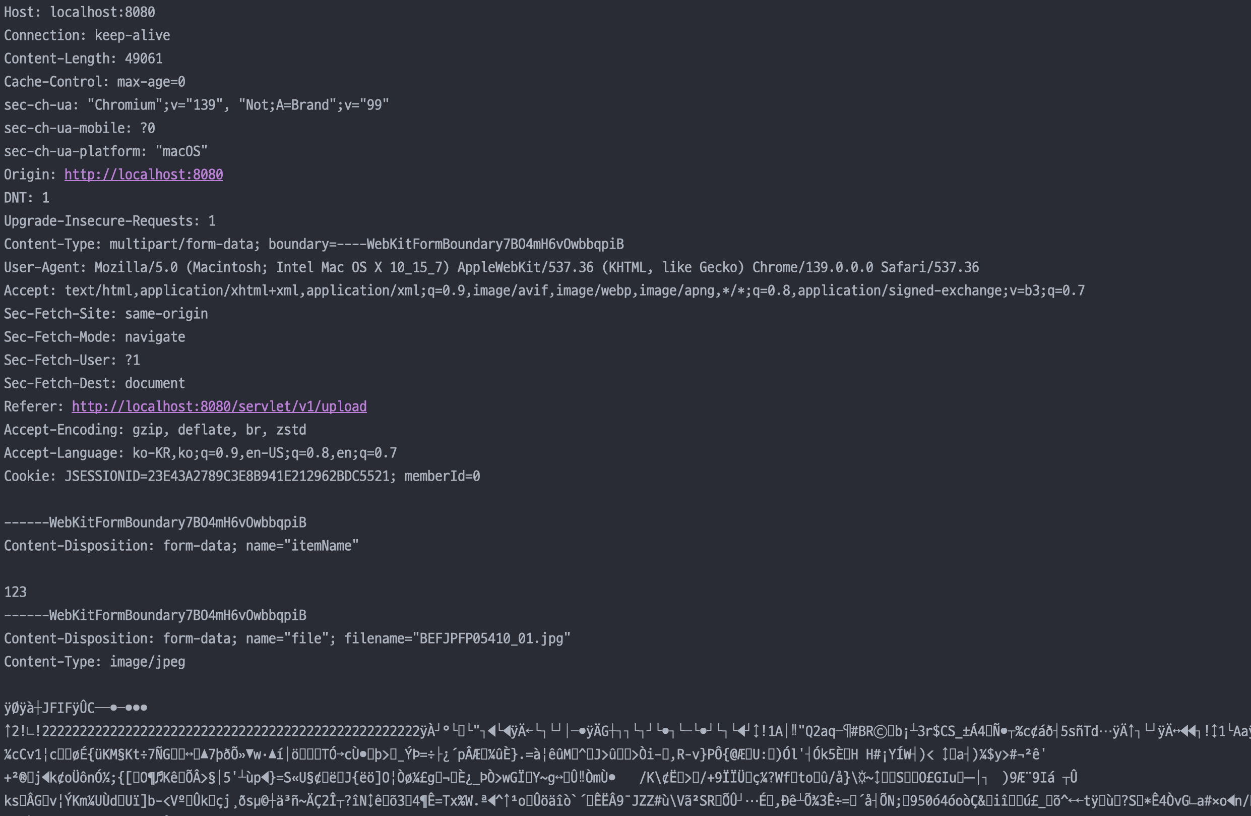 username, age, file1이 각각 분리되어있고, 일반 데이터에는 각 항목별로 문자가 전송되고, 파일의 경우 파일 이름과 Content-type이 추가되고 바이너리 데이터가 전송된다.