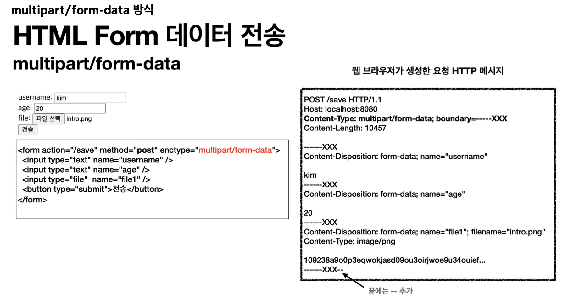- → 문자 + 바이너리(파일) 데이터를 **part 단위(boundary 구분)**로 전송