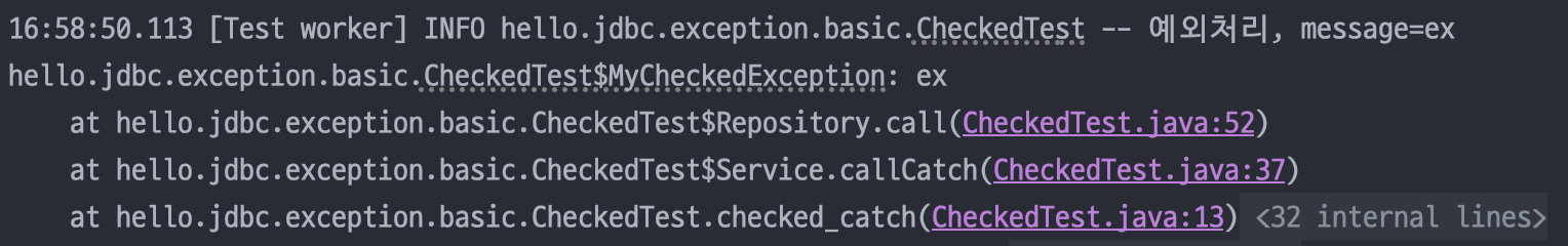 기존 예외를 포함하는 경우엔 기존에 발생한 체크예외(SQLException)와 스택 트레이스를 확인할 수 있다.