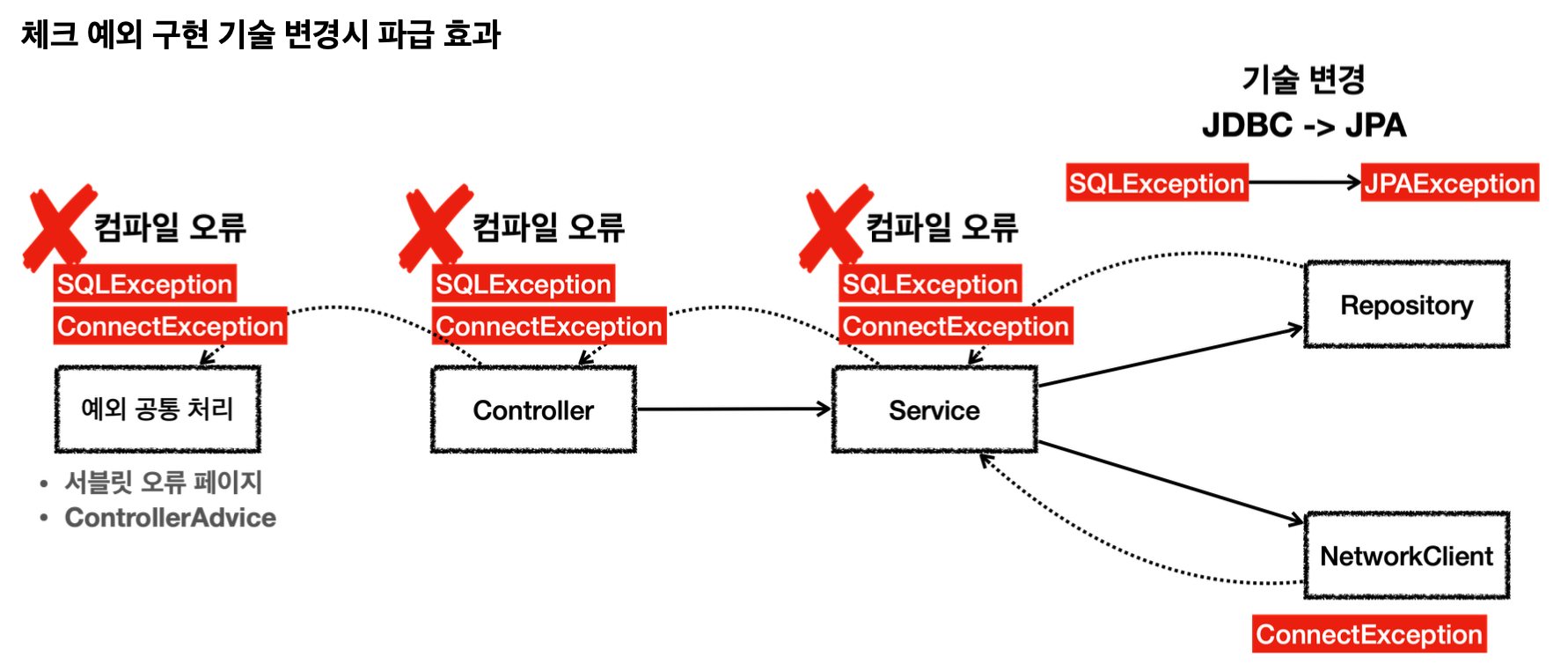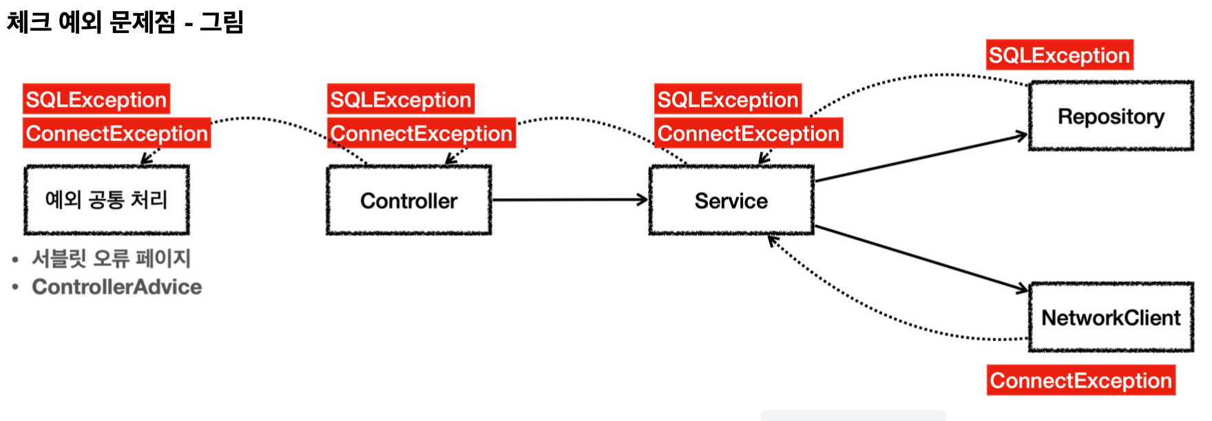 - 서비스는 Repository, NetworkClient 둘다 호출하기 때문에, 서비스는 SQLException, ConnectionException을 둘 다 처리해야함. 그런데 서비스는 둘을 처리하는 방법을 모름. 위 예외가 터졌을 때 서비스 계층에서 해결할 수 있는 방법이 없기 때문에 컨트롤러로 예외를 던져야함