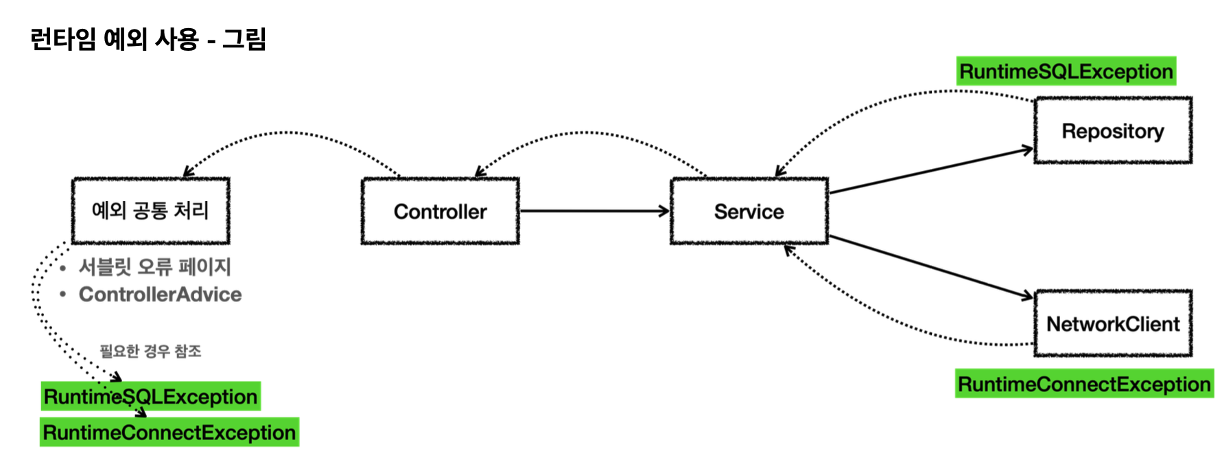 - 처리할 수 있는 체크 예외라면 서비스나 컨트롤러에서 처리하겠지만, 위 같은 문제는 해결할 수 없다.