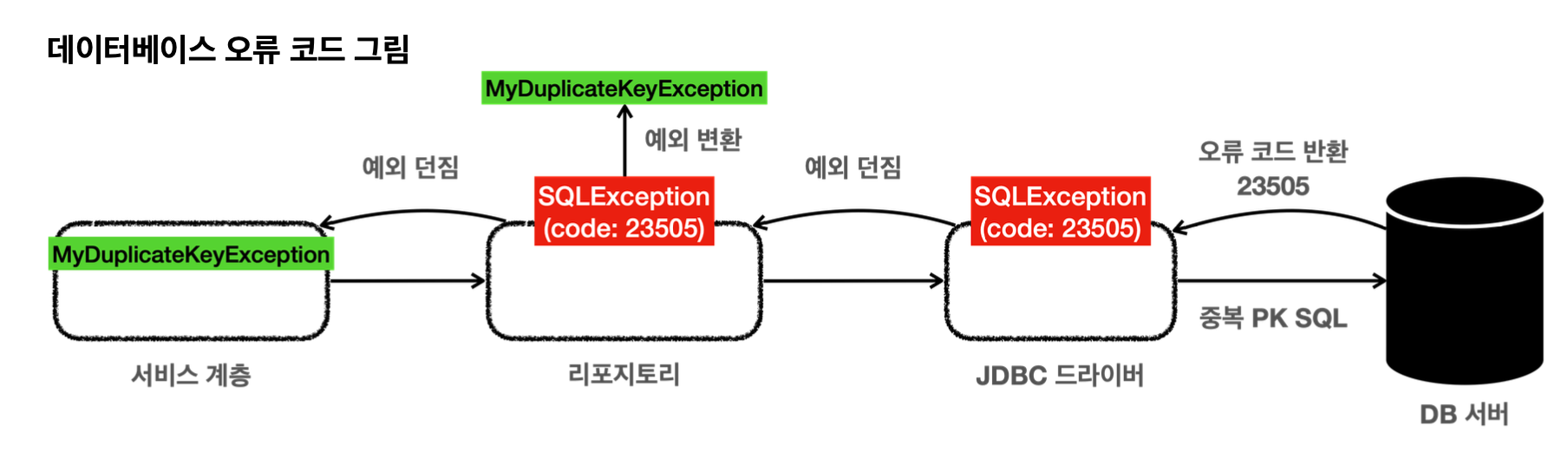 데이터를 DB에 저장할 때 같은 ID가 이미 데이터베이스에 저장되어 있다면, 데이터베이스는 오류 코드를 반환하고, 이 오류 코드를 받은 JDBC드라이버는 SQLException을 던진다. 그리고 SQLException에는 데이터베이스가 제공하는 errorCode가 들어있다.