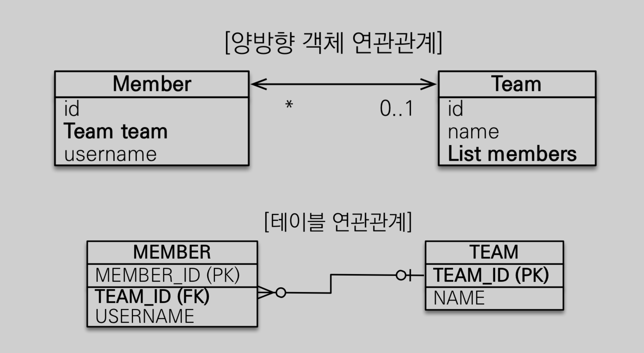 객체의 양방향 관계는 사실 양방향 관계가 아니라 서로 다른 단방향 관계 2개다.
